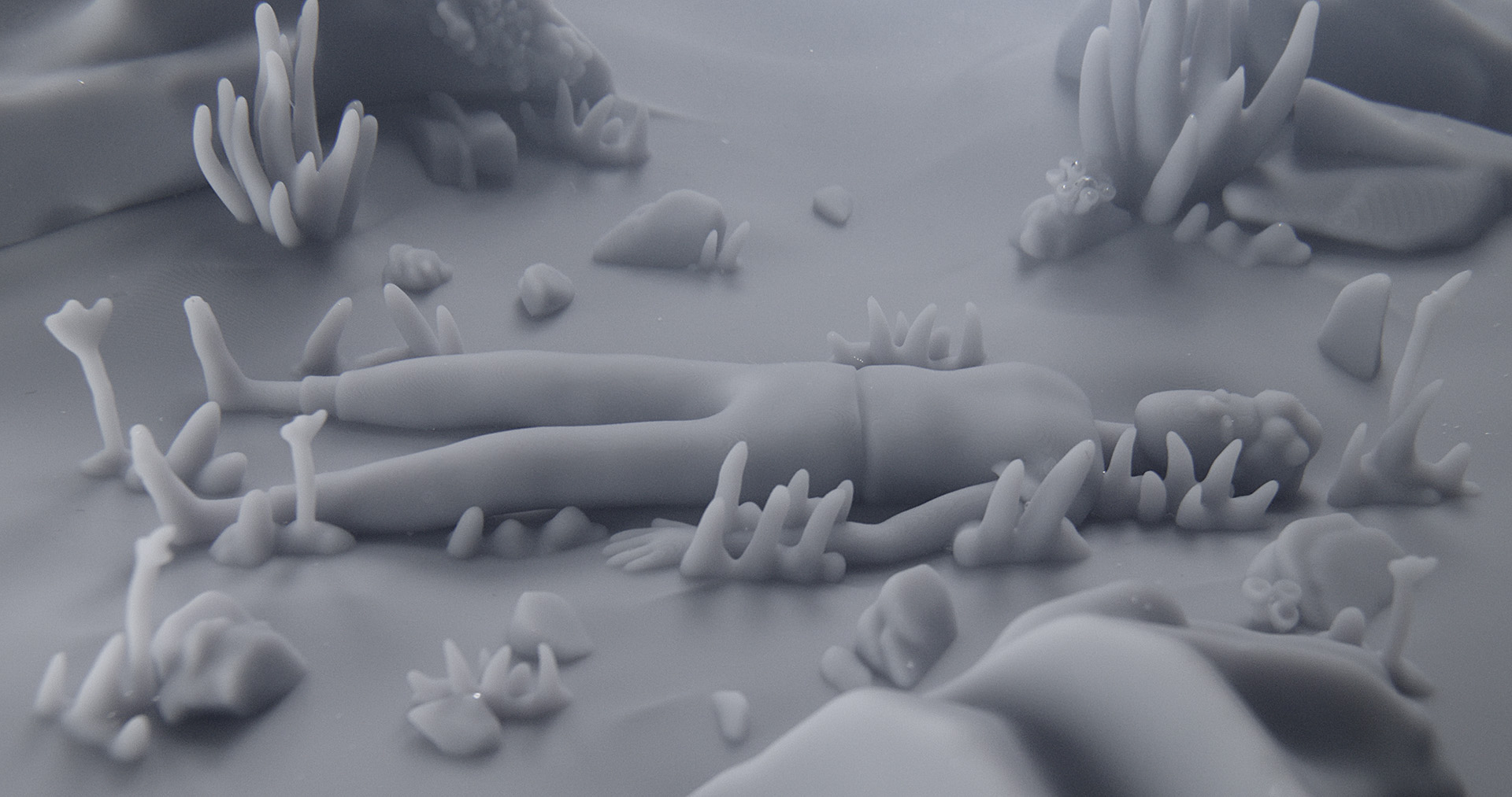 These printed miniatures are submerged in water and filmed with a macro lens. Shooting underwater allows dust, particles, and fog to drift naturally among the sets, creating dense, controllable atmospheres.