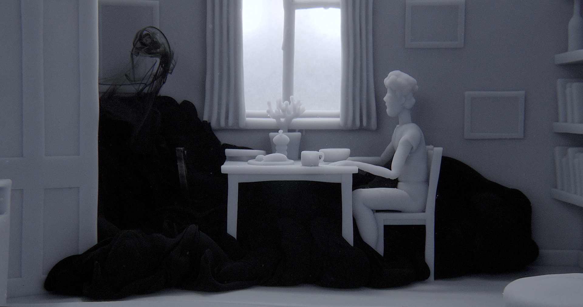 The story is told through a series of living stills and monochromatic miniature sets, carefully lit and filmed with a macro lens to immerse the audience in the tiny sculpted world. The choice to film static 3D-printed miniatures emphasizes the concept of being frozen in time, adding to the sense of long, unchanging intervals.